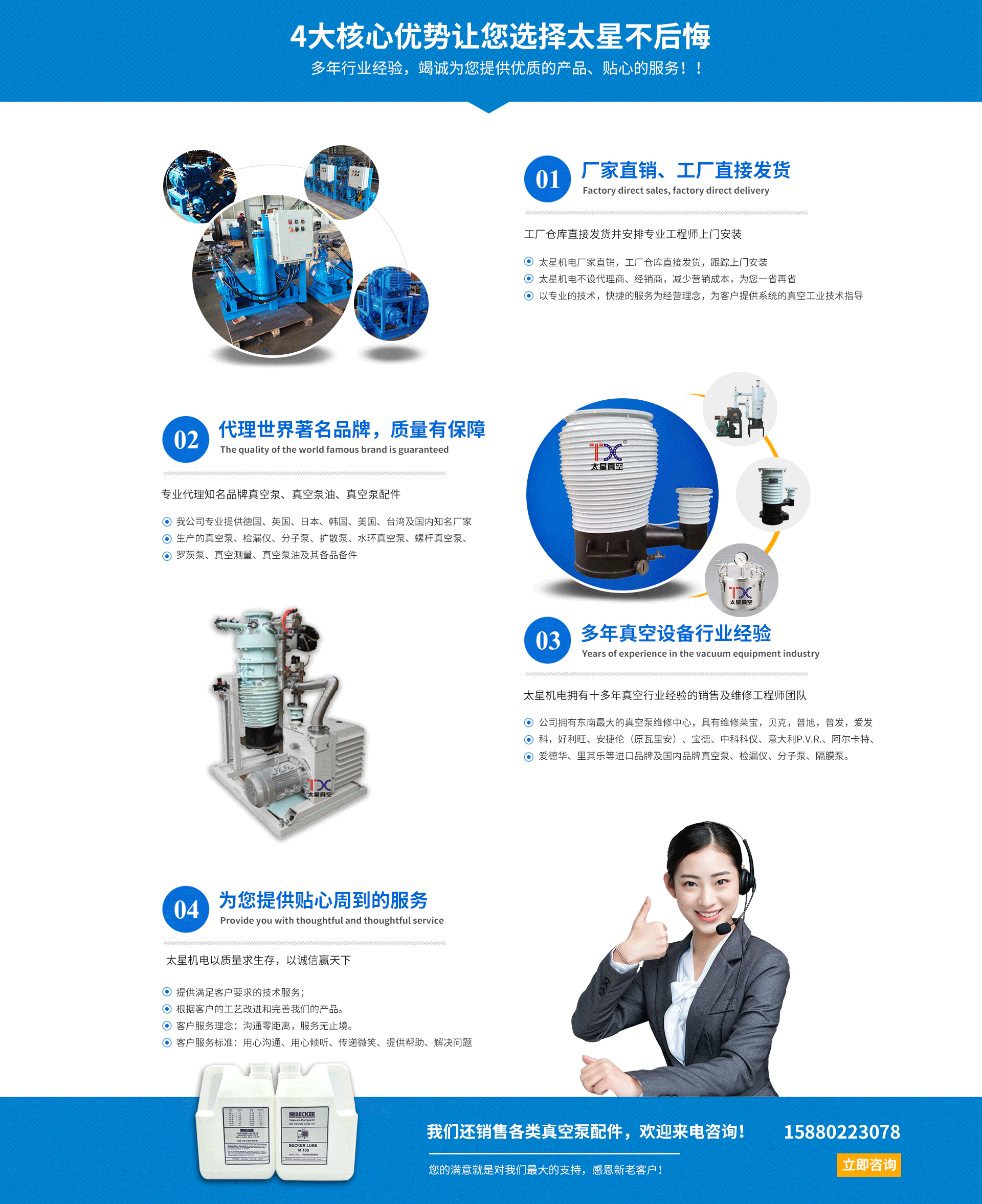 廈門太星機電有限公司于2009年成立于廈門集美,是一家真空工業服務企業。廈門太星機電有限公司擁有一批技術維修團隊,在維修方面有精湛、豐富的技術經驗,標準的維修車間,標準的維修工具,規范的作業流程。為客戶提供完善可靠的服務,以精致維修,價格合理,提升真空設備的使用價值。 廈門太星機電有限公司真空工業銷售和服務。以技術雄厚的服務能力廣受客戶的認可,應用于上百家客戶,提供了優良的服務,應客戶需求定制價值高的真空工業解決方案。 主營范圍: 1、銷售真空泵、真空配件、真空泵油、耗材、真空部件; 維修保養干泵、分子泵、旋片泵、機械泵、羅茨泵、渦旋泵、氦質譜檢漏儀、羅茨風機、隔膜泵、柱塞泵、水環泵、真空儀器、真空閥門等真空設備; 真空系統的定制、優化、改造、升級。 真空系統檢漏服務; 非標真空工程的規劃、設計、施工、調試、培訓服務; 3D打印機及3D打印服務; 2、進口真空泵的銷售、維修和保養的一條龍服務,如Agilent安...